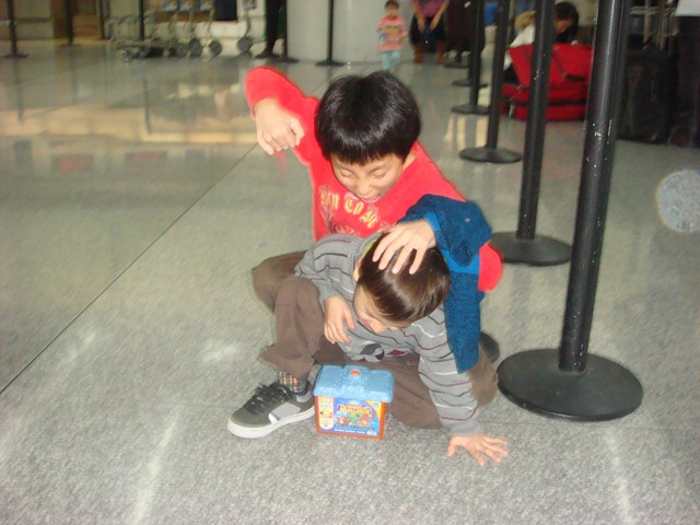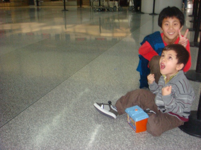 York has graciously volunteered to take us to the airport. We will in fact travel in style and with escorts – his cargo van and Shao and Sebastian in tow. They arrive at the hotel a bit early – which is to stay they were only 15 minutes late – and we load up the van and head to SFO. We want to get better seats on our return flight, so we make sure to get to the airport by 11:15AM PST (3:15AM CST) and we quickly make it to the check in counter. We check in five pieces of luggage (smaller gifts please) with our two heaviest pieces just straddling the 50lb limit at 49 and 51lbs (this is why Yang packs). The check in process takes a long, long time. Suffice to say the check in clerk is really nice and she needed to be because she was really,really slow. It did give the kids time to bond (pictures taken by Lydia)