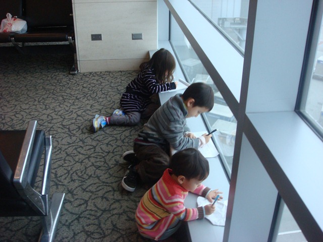 We got a bulkhead row – four seats across just in front of the movie screen – so our early arrival was worth it. York and Shao were nice enough to run down to La Tapitia and get us some burritos, saving us the horror of Air China meal service (think frozen TV dinner) which we managed to eat anyway. We spend some more time with the Fremont Chao’s and at 12:00PM PST (4AM CST) head to the security check. More waiting and it turned out our flight was delayed by an hour. The kids took the chance to draw, even Elisa getting into the act.