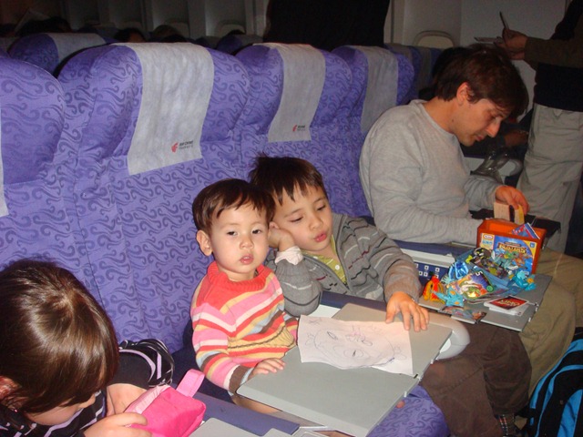 We board, scrounge some overhead space for our carry-on backpacks, and by the time we takeoff everyone is asleep but me. It is now 3PM PST (7AM CST). The flight was mostly uneventful. Kids slept for a couple hours, then awake for eight, then slept for the final two. Aidan and Lydia were comfortable entertaining themselves, Lydia with her drawings and watching DVDs. Aidan with his homework, toys, and games. Yang and I took turns taking care of Elisa which is to say Yang mostly took care of Elisa. Well, I actually did help a bit. Elisa was happy but active and not wanting to stay in our seats. So we (she) walked her (us) around a lot.