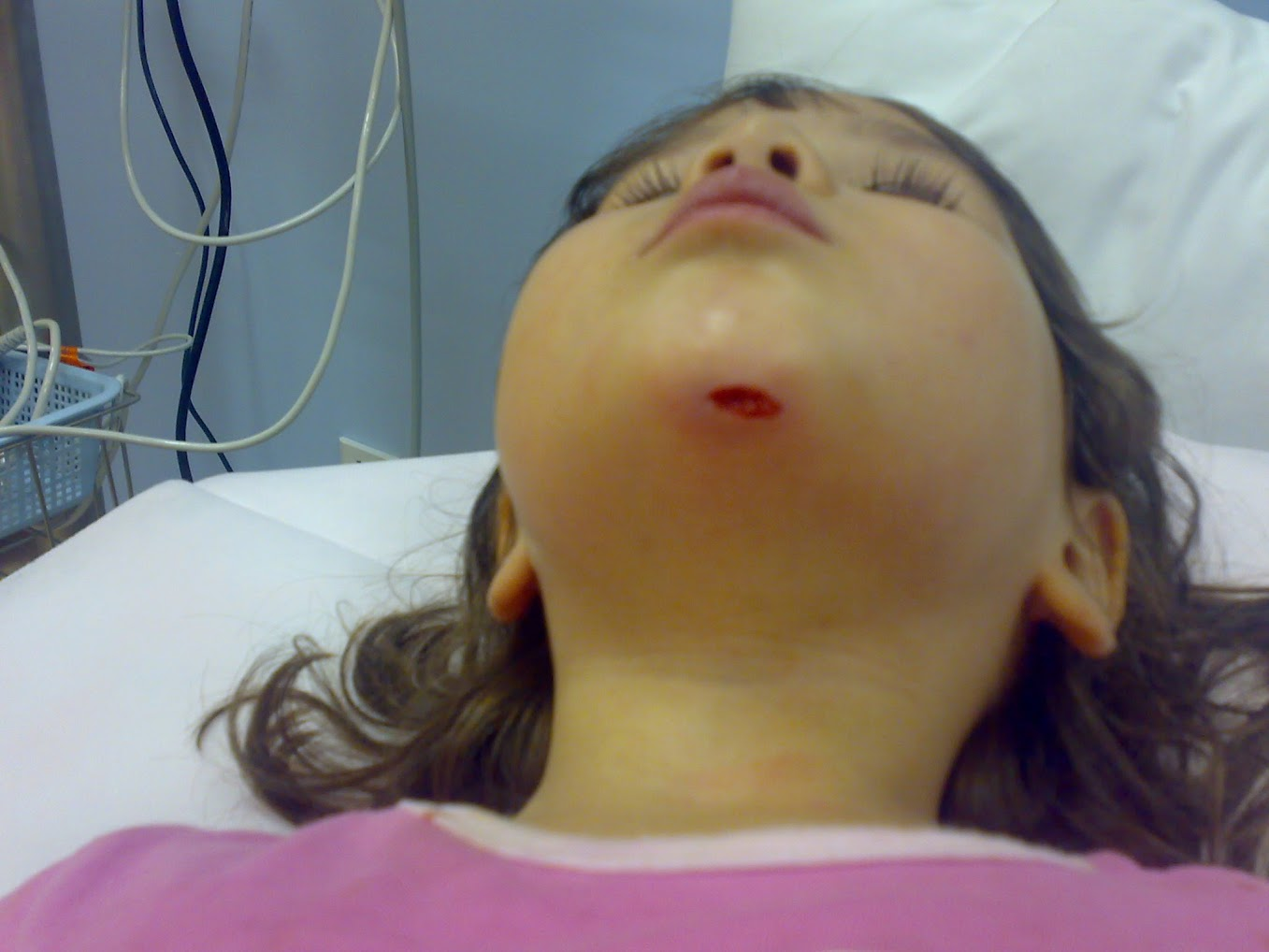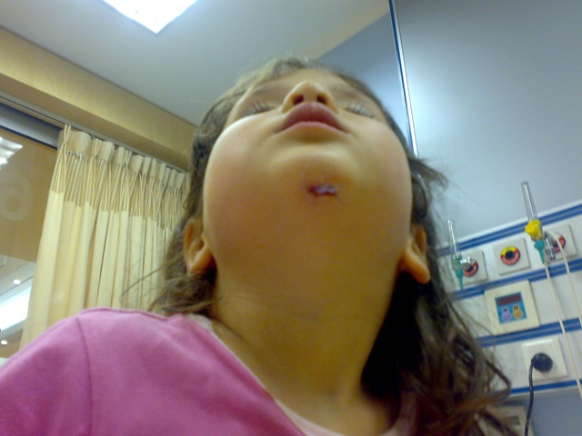 It is the night before Lydia’s birthday and Yang and I are sitting in the bread store trying to decide to have a snack in the store or just go home. Yang’s new cell phone rings but she doesn’t answer it because it is in my back pocket and the phone sounds like something a 13 year old village girl would have. I continue on the great stay/go debate when Yang asks for her phone, sees the Ayi called, calls back, and gets up with more speed than a nine month pregnant woman should have. She is still quite slow, so I am able to catch up and ask who’s called and she says “Lydia’s been hurt” and then Yang is out the back door and we see our Ayi holding Lydia near the playground behind the bakery. We see some blood in a cloth and Lydia has a gash under her chin, right away it is obvious that she will need stitches. Yang calls ahead to the hospital where the kids get their check ups and where Elisa will be born (any day now) and finds out they don’t take this kind of emergency. Luckily, another very western style hospital is a block away from our house and they have a full service emergency room. American, white doctor, chinese nurses speaking excellent English, and Lydia all stitched up within an hour. Aidan’s eyes swelled up when retelling the story of how Lydia got the cut. Lydia was very strong when getting the stitches and while she let us know she good feel the pain, she kept the wiggling and fussing to a minimum. The whole thing cost 3800 kuai (about $550 USD) and my insurance covered it. A year ago, the insurance I had would not of covered it so it is lucky Lydia decided to crack that chin this year. Yang told the Ayi the cost and the Ayi said that in her hometown, the cost of a c-section is less than half what these few stitches cost.