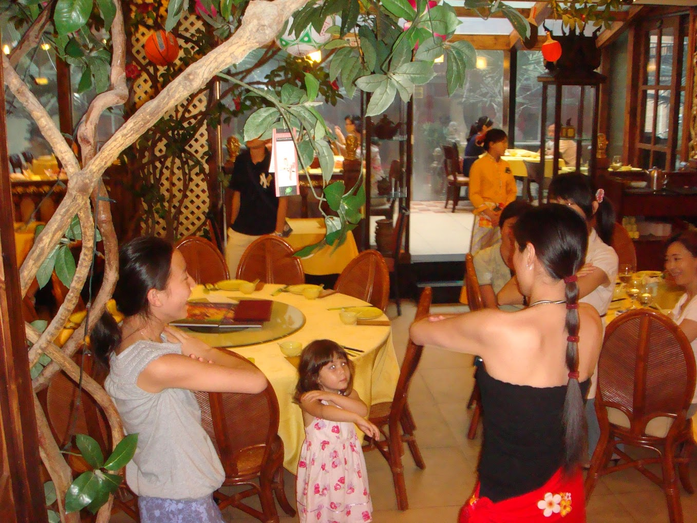 The next day was her birthday. Hard to believe she is four. I took off from work a bit early and found her napping when I got home. She napped and napped and napped. Seems being four is exhausting. Eventually she woke up and I took her by myself to fetch her present. I let her pick out any bike she wanted and surprise, surprise, she picked the pink one. She was pretty happy to be getting the special treatment. She enjoyed her baskin robbins ice cream cake, her ballerina dress, and her new pink dress from the American grandparents. It was off to Thai food with the family and a couple of friends. Lydia showing anyone who would look, her new bandage. Lydia dancing with the Thai dancers and the older daughters of the friends who came with us.