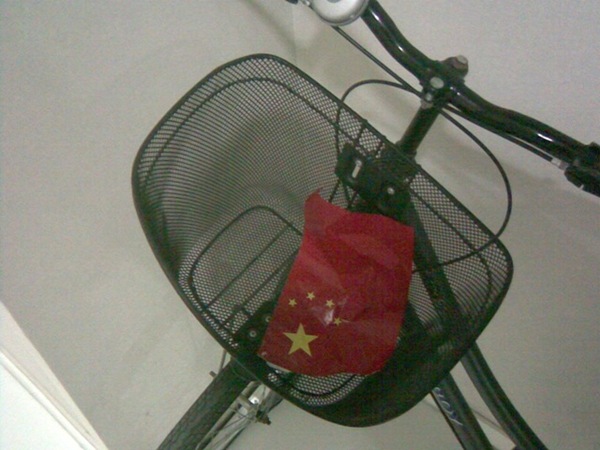 Lydia is mad when we get home. It seems the one kuai Chinese flag is torn and the flagstaff has become disconnected. She gets over her discontent quickly and the torn flag remains in the bike’s basket until the end of the holiday, when I put it in the trash.