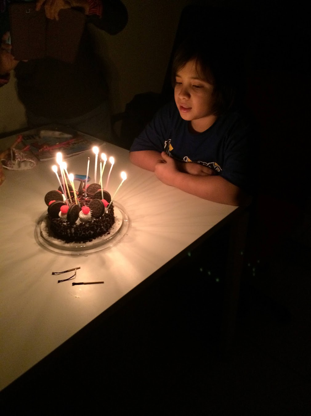 Aidan made a wish (a serious looking one) and blew out the candles while be serenaded to spotify’s happy birthday and family singing happy birthday. He made the first slice and while he was having his first slice I brought him his gift.