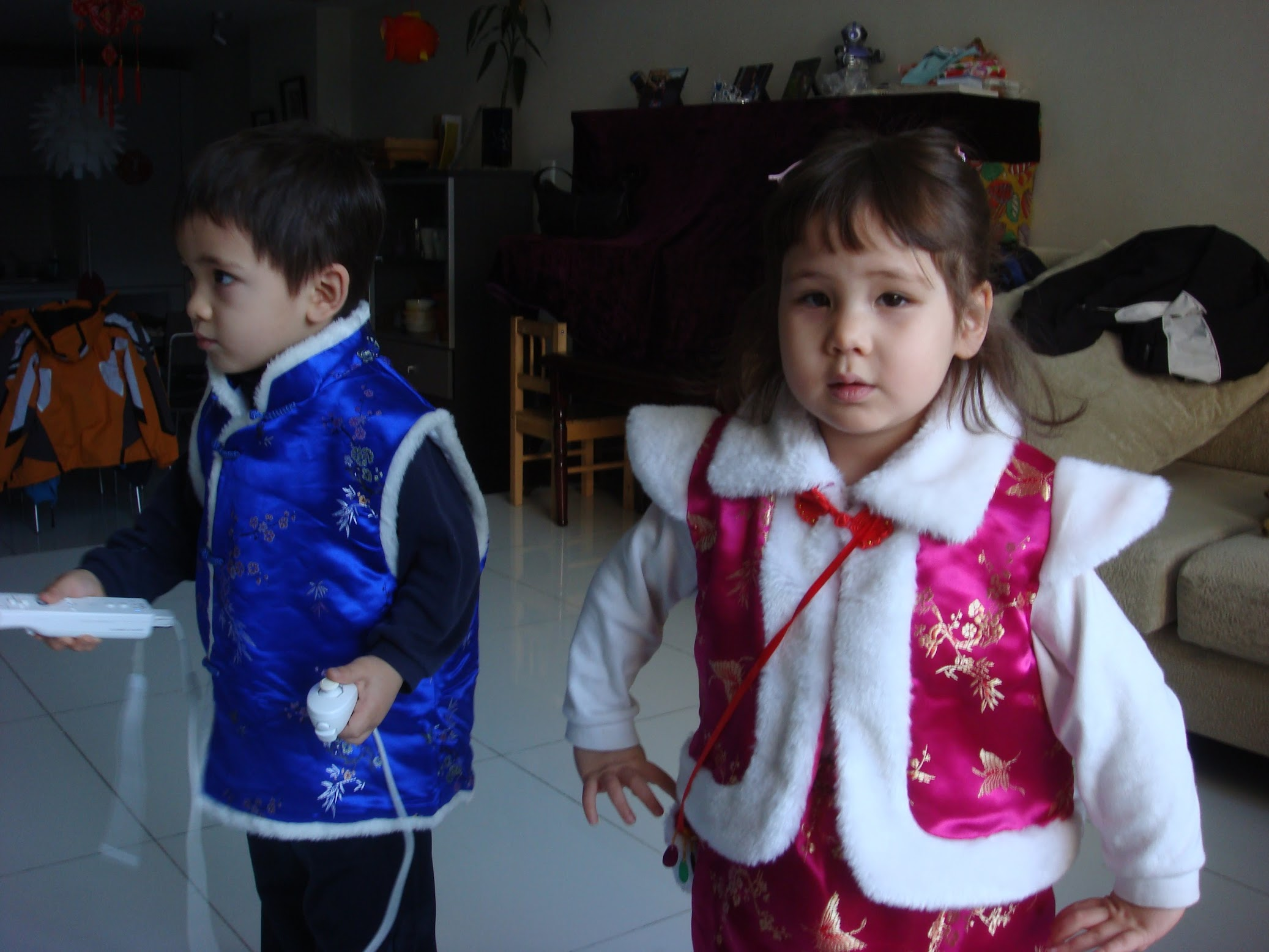Yang got Aidan and Lydia these really cool outfits for New Years. Notice Aidan’s focus playing the Wii.