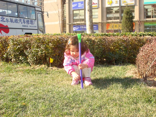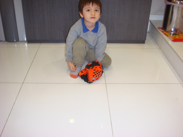 I come home after dinner with a friend and Aidan is waiting for me. “Bobbi, I want to play baseball” he says. He’s been wanting to play baseball a lot lately. I say “ok” and the game is on. Aidan digs out the plastic baseball bat and the small glove I brought him from the US. One problem, no ball. He starts to dig into the toy pile which sits in the corner of our dining room (we live in kind of a small place – no play rooms for sure). I join the search but neither one of us is having any luck. Aidan asks for the Ayi’s to help. He asks in Chinese and I know the word for ball (qui 球) so I know he’s asking. Soon we have two ayis and myself looking. Aidan, obviously smarter than me, has moved on once he delegated the task. He is now putting on the glove. He mistakenly puts it on his right hand so I show him it goes on the left. Sure enough one off the Ayis finds the ball and the game starts.