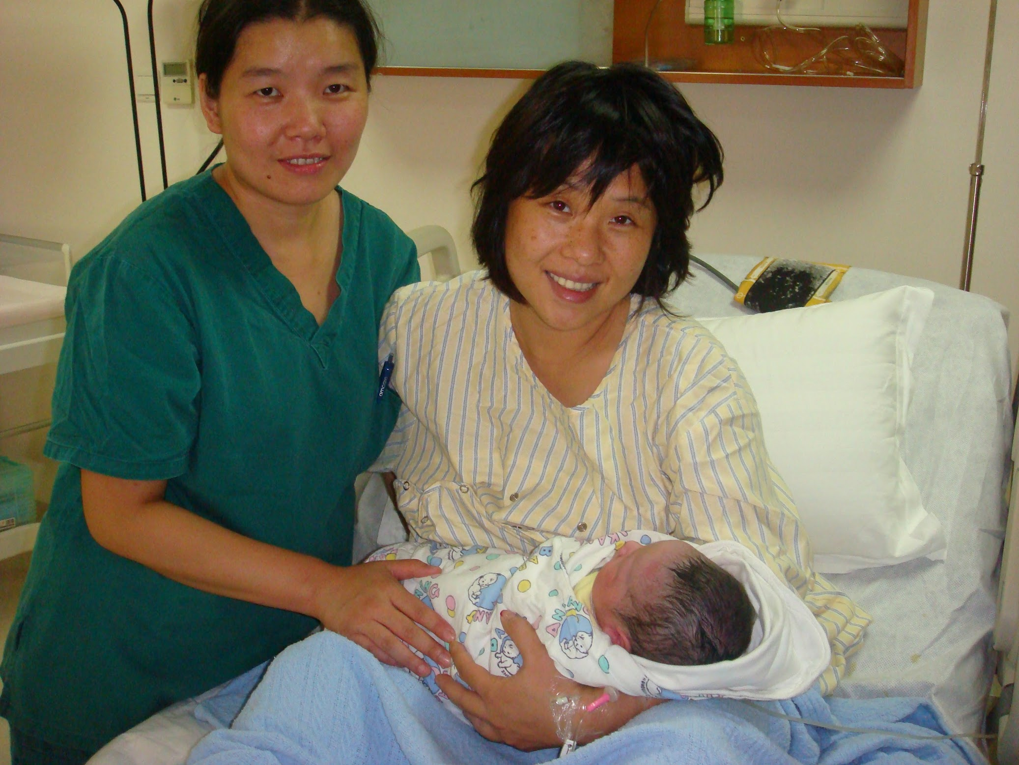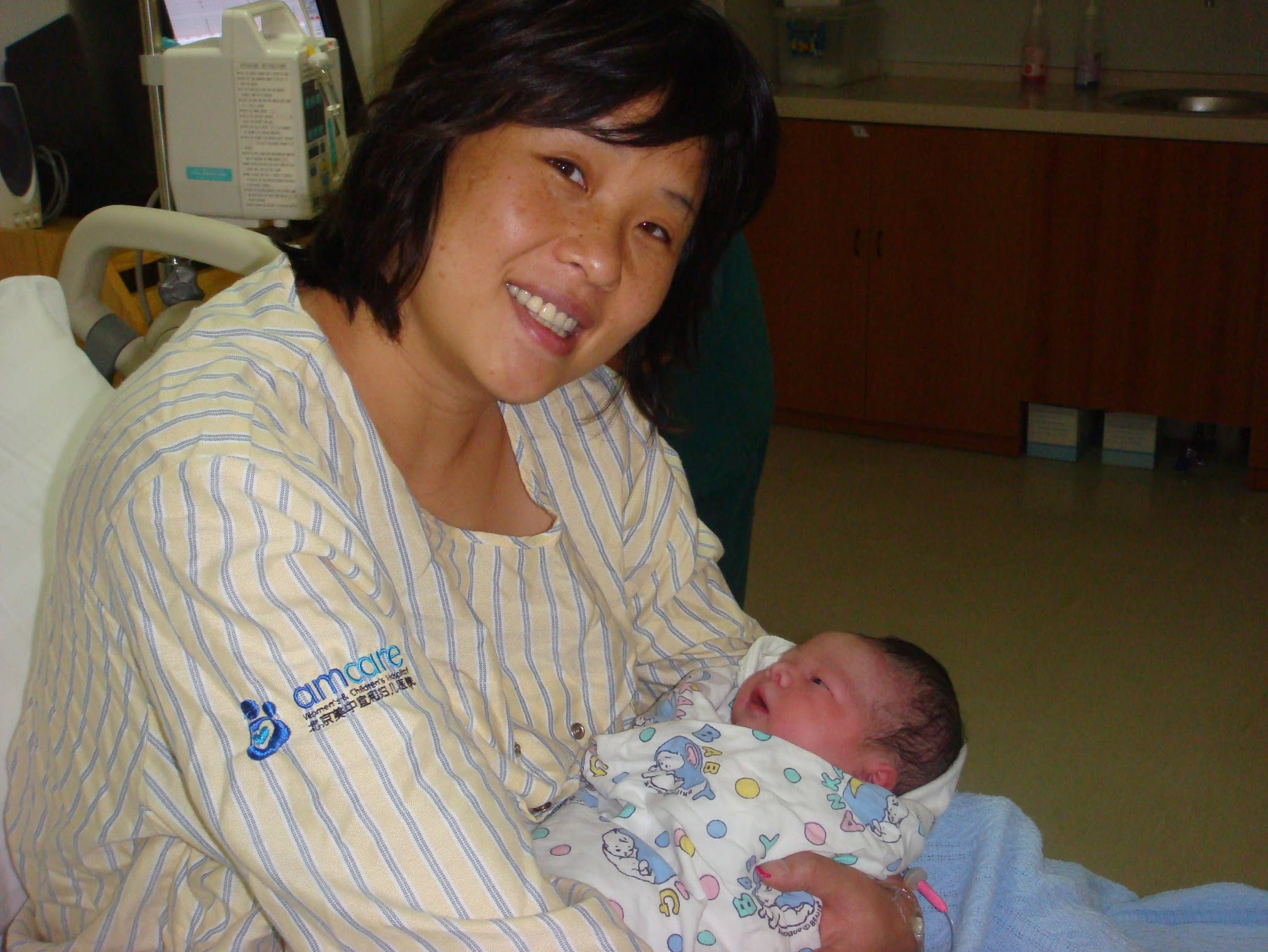 Yang with Elisa shortly after birth. Yang posing with the mid-wife.