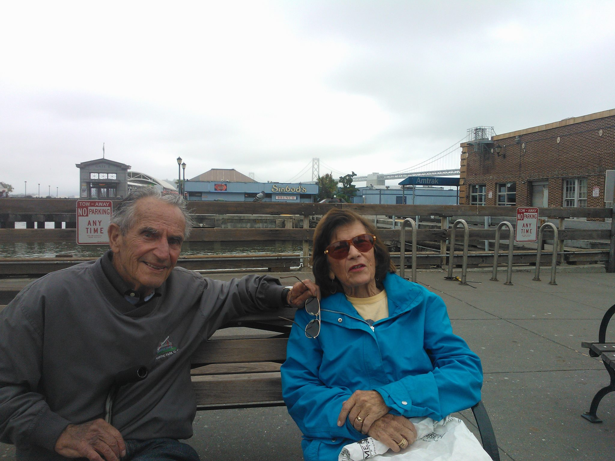 We take 101 and then the 280 extension to sixth street. We dive past AT&T park and comment on how nice the area has become since the Giants moved into this part of town. We drive past the future home of the Warriors which is right now just a slap on concrete extending into the bay. We park strategically, my dad always parks strategically. No meter charges here on a Sunday and just enough of a walk to Peet’s. We walk, I take a picture of the bridge which looks strangely rural. My dad needs to take a rest so we stop on some benches. I take a picture of my parents.