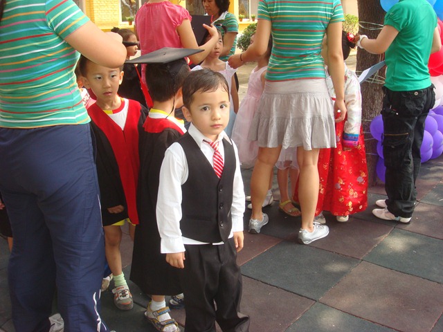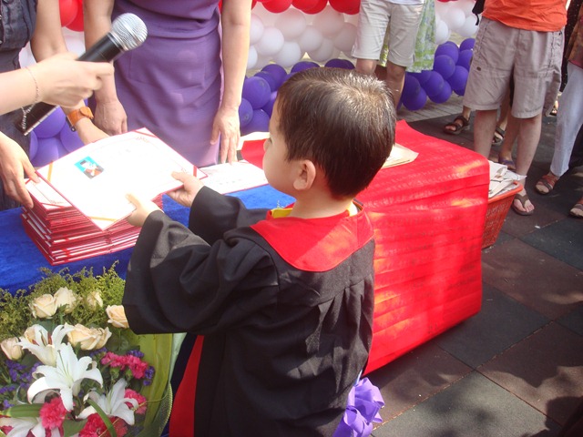 On a hot and humid Beijing July morning, Aidan graduated from a Korean kindergarten. Yang and I walked the 10 minutes to his school, through the starbucks, passed a row of simple restaurants offering everything from xinjiang food to casual italian, passed the international hospital, passed the cement twelve story apartment buildings, passed the small shops serving people’s daily needs. We crossed two busy streets, Elisa in stroller, looking both ways. We turned into a small alley and were soon at the school’s gate. The school is called GenMuZanDi which is as international as its name; you won’t find it in any of the school guides for foreigners here. The students are mostly chinese and korean with a couple foreign kids mixed in. From a preparing him for first grade perspective, the school served Aidan well. He had homework most nights, he can do math that some of my siblings would struggle with, he can read and write a fair amount of Chinese. On the other hand, as the small boy in the class and as one of the two mixed boys in the class he didn’t fit in all times. It got better as the year progressed and he came home with his toys and skin in tact.