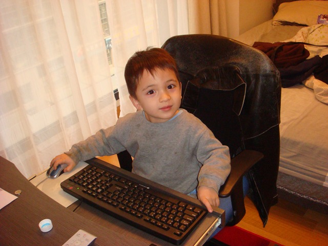 Aidan has discovered that he can play Wiggle games online. All we need to do is point him at the web site and he is off playing a variety of games. He’s quickly learned where to click, what not to click, and even type his name. He focuses on the screen like his baba but with better posture.