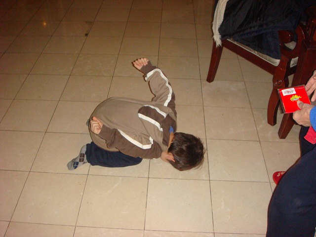 Aidan getting ready to have his cake. One of those plastic ball dragon things is in his right hand. Picture next to it is Aidan kowtowing for Chinese New Year money.