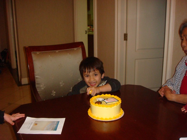Anyway, we head over to Baskin-Robbins and pick up his ice cream cake, the one Yang and I ordered for him six hours before. The one we will have in a few more hours as we celebrate his birthday. We are celebrating seventh Aidan’s birthday five days early because Yang and I will be heading to Indonesia tomorrow, returning late on the 21st. Aidan is good with that as it means he will get his toys five days early.