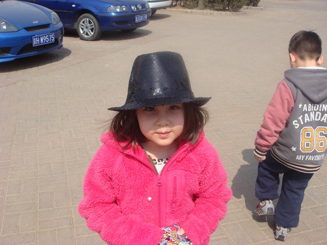 I’ve been a bit worn down and not seeing enough of the kids as I would like so I decided this weekend would be a family weekend. Which is kind of hard because the kids can contribute to the worn down-ness feeling especially if you are, as I said, starting out worn down. But what is not to love about Aidan’s fascination with Pokémon Cards, Lydia’s joy with her purple horse, and Elisa’s exuberance for old fashion chocolate donuts. So Yang and I debated on where to take the kids. We considered the wild animal park out by Badaling but was worried about the traffic and (at least me) the effect on the kids of seeing small animals eaten alive by lions. Especially since Lydia really wants a rabbit and rabbits are one of the main feeds. So we instead focused on a outing closer to town, in Shunyi. After a hearty lunch, we headed over to a villa complex that was rumored to have rabbits. In the parking lot out front, Lydia demoed her new hat, which she said was a Michael Jackson hat. (MJ has been really popular here, especially after his death)