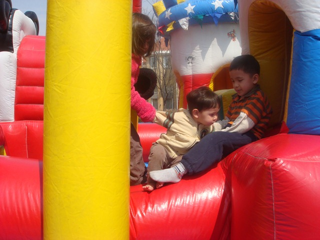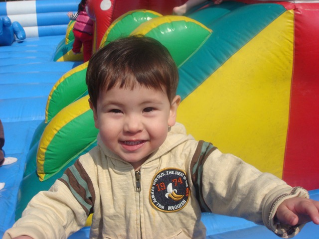 So we heading inside and indeed there were rabbits. And you could buy one to take home for 20 RMB. Or 1 RMB less than my morning starbucks coffee. Yang told me not to tell Lydia they were 20 RMB, since Lydia wanted one so bad. I told Yang, yea, but for 20 RMB they are pretty cheap for dinner. And with that we headed out back to the slide float thing. All three kids got on and had a blast (by the way, cost per kid was 20 RMB). While they played, Yang ran into an old friend who she used to play Mahjong with. They talked some and he suggested I do a better job teaching them english and I guess he is right.