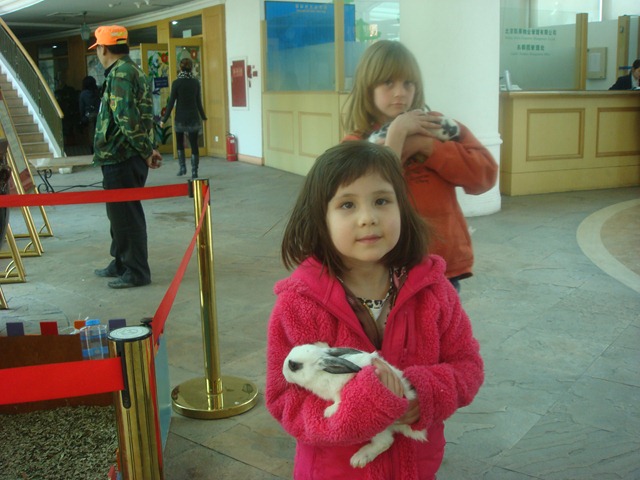 We headed back inside to the rabbits. There were two young girls holding rabbits. They were holding them when we came through the first time, the rabbits seemed quite content with them. When Lydia tried to grab a rabbit it scurried away. She tried another, it ran away to. I was thinking our Ayi could catch one since after all she probably has experience cooking these suckers but I thought better of suggesting that. One of the rabbit whisperer girls came over and wanted to help Lydia. Distracted with my rabbit thoughts I never did know if it was the girl or Yang who helped Lydia. In any case, success at last. ydia got to hold her rabbit if not take it home (a fact she complained about for some time).