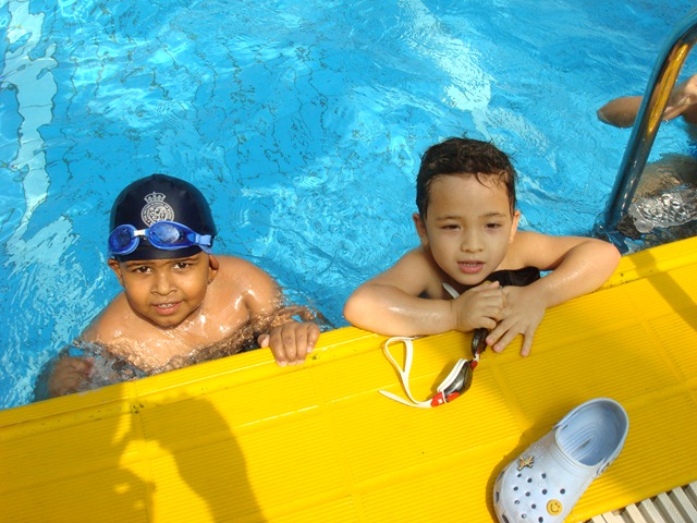 Sebastian does arrive and in a haste him and Aidan head down to the pool with Yang. Aidan has been taking swimming lessons all summer and can now swim by himself. He is excited to be in the race. Sebastian swims, well, really well compared to the kids here. He is also ready to go and I have no doubt he will win.