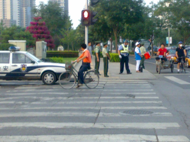 Beijing has found a way to solve it’s jay-walking problem. The much less effective Olympic volunteer is in the white hat with red flag.