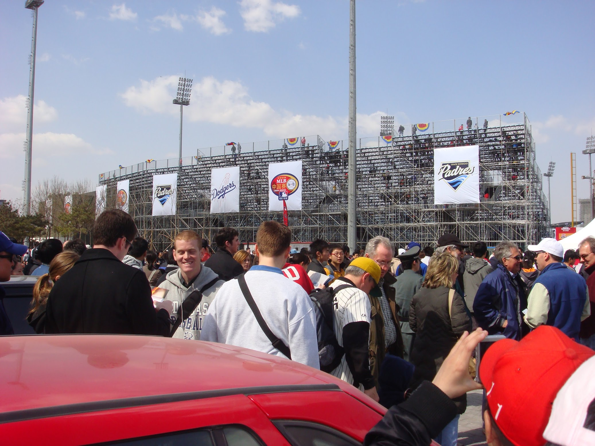 Aidan talking to Yang outside the stadium and our view waiting to get in
