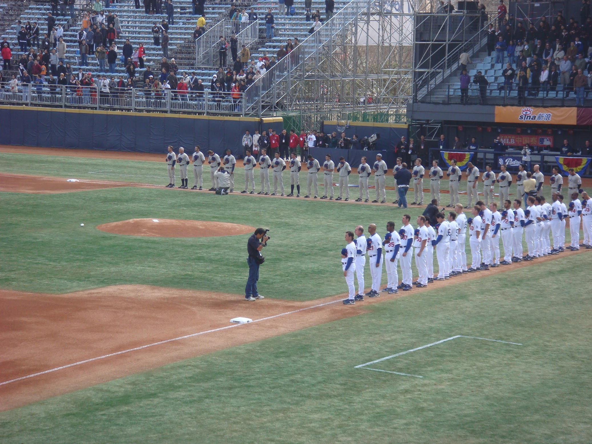 Then a strange thing happened. The Padres took the field and tossed the ball around. The pitcher had finished his warm up throws and he noticed something was missing. Umpires. There were no umpires anywhere to be seen. The players stood around and then the umpires emerged from the locker room (American umpires, btw) and the managers exchanged lineup cards. Top of first, three up and three down, all weak infield grounders. An older Beijing couple – a stereotype looking lao Beijing couple – got up from their seats and with a dismissive wave of the hand to the usher left the building. I suspect they had received free tickets (a fair amount were given away) and had made the executive decision that they had seen enough.