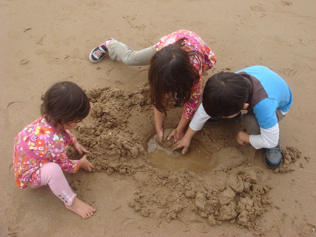 Much of the rest of the time was spent either at meals or at the beach. The weather, especially the first two days, was awesome fall weather with the ocean breezes remaining me of my previous home. I even started to think a second home in Qingdao would be a good idea to get away from the big city because sometimes you just need to get away (that said, Qingdao population is 8 million). The kids loved the beach and since there are few foreigners there, they got plenty of attention. They are used to it now, as we parents are, and we just roll with it. I love seeing how the kids play at the beach. On the last day, I say Aidan and Lydia digging a big hole and lying a paper bag across the top of it and then putting sand on top of the bag. I asked them what that was for. It was a fake beach floor to catch the unsuspecting foot. They thought this was hilarious and Aidan demoed the effect.