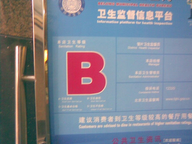 In the past few weeks restaurants all across Beijing have been posting there sanity rating, a letter grade from A-D. Apparently you cannot flunk. Mostly one sees Bs and a few As. Starbucks has an A. The korean fast food restaurant with five types of dog on the menu received and B. There are no actual Cs or Ds posted, at least that I have seen. But there are plenty of restaurant with no posting which either means they got a C or D or they have not yet been rated. If I was a restaurant owner I would post a big sign “not yet rated”. Who knows, maybe they have and I just can’t read it. In any case, I am avoiding all restaurants without a rating. Here’s the rating sign for that Korean fast food restaurant.