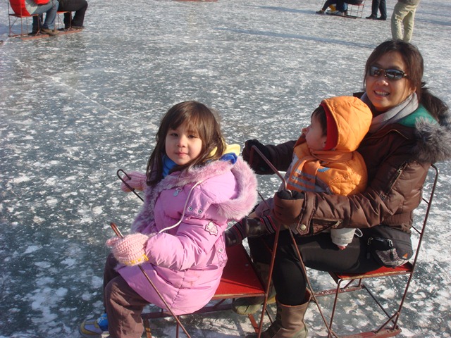 After the snow fight, Aidan is a bit downtrodden and cold. I want to say that’s what happens when you lose a snow fight, but then i realize he isn’t quite seven yet so it isn’t quite fair that don’t let him win. So I go over to where he is standing and I write his name in big block letters in the snow. And he writes his name in Chinese. Soon we notice Yang and Lydia are gone. The park isn’t that big, so we walk in the direction we think they went. We spot them on the frozen lake riding a sled. A sled very much like this one which we rode on Houhai last month.