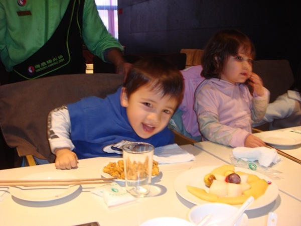 So, enough, right? No, because Monday was Yang’s actual birthday. I took her to Capone’s, an upscale Italian restaurant in our neighborhood. It wasn’t very crowded and wasn’t very cheap, but is was quite good. We topped off the evening and the five days of parties, with chocolate cake. Aidan and Lydia leading the way in their own version of Happy Birthday!
