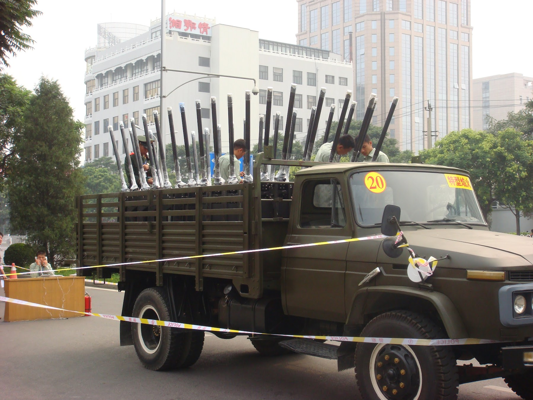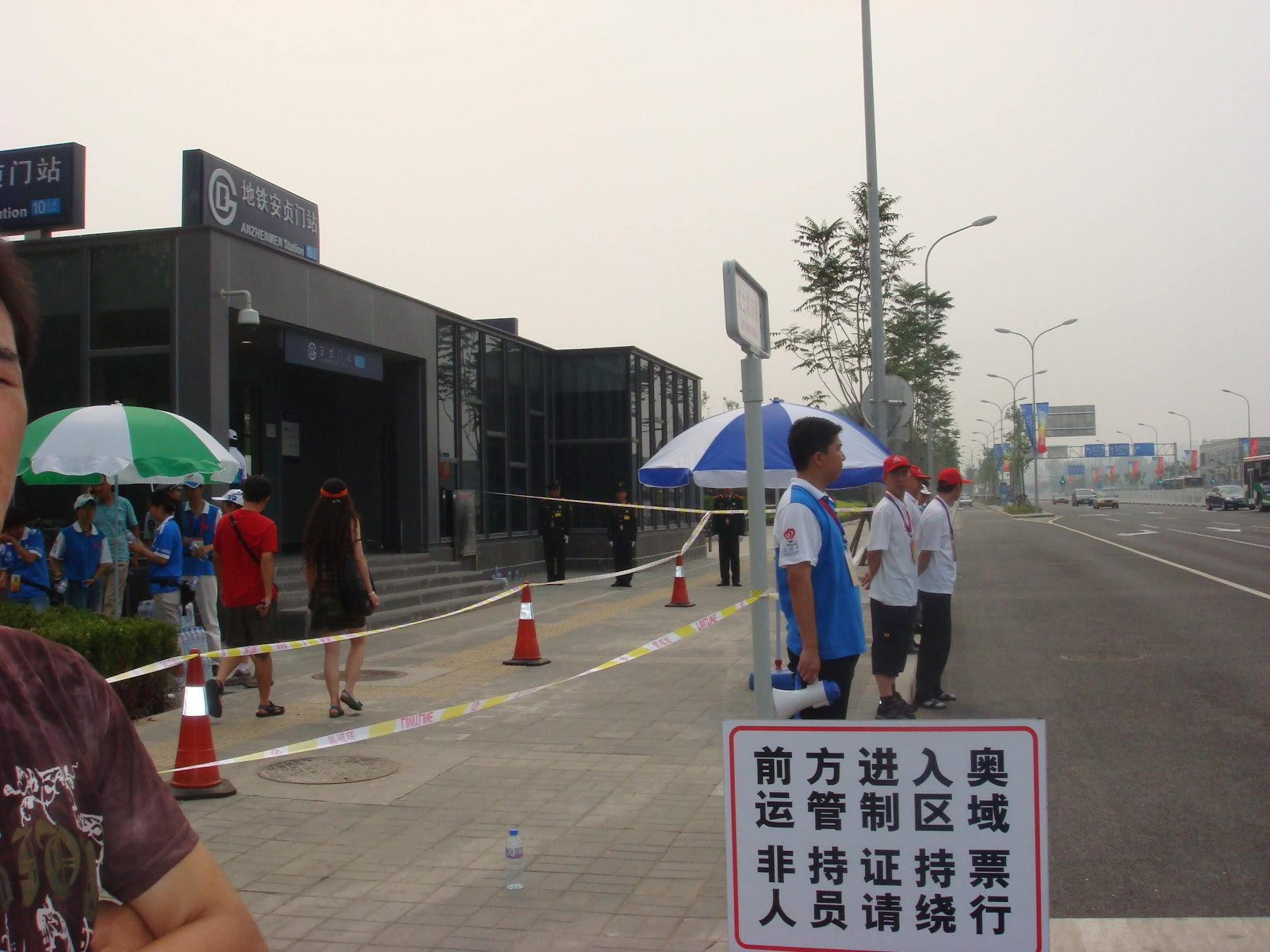 A subway east of Olympic green. The white shirted are part of security volunteers, these are more alert looking than most. On the right side, I believe are fireworks used as part of opening ceremony. This picture was taken just north of drum tower where an American was killed in a very, very untypical attack. (I took this pictures while biking around town the afternoon of opening ceremony)
